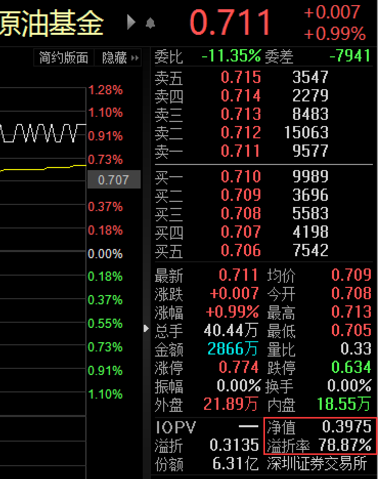 这里老罗友情提醒下,现在千万不要去场内买原油类的基金,很多溢价率很高,就以161129为例,实际净值只有0.3975,场内的价格却大跌0.711,溢价率达到78.87%,如果未来打开申购,套利资金进入,回归实际价格,场内高价买的投资者就很惨了,真不知道是谁把场内的价格买的这么高,严重偏离了实际的价格。