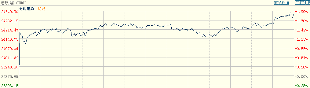 受市场预期积极等推动,美股昨夜继续上涨。道指大涨近2%,报收24331.32点。