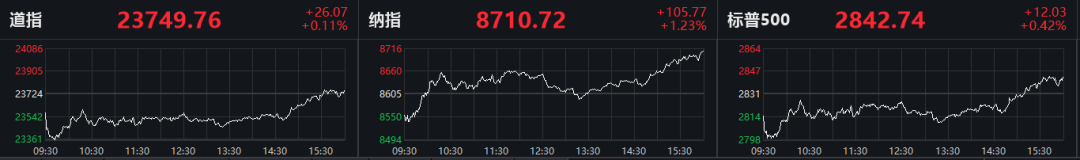 周一,亚太股市纷纷收跌,美股开盘承压,但在科技股和能源价格走高的带动下,实现低开高走。截至收盘,道指上涨26.07点,涨幅0.11%,报23749.76点;标普500指数上涨12.03点,涨幅0.42%,报2842.74点;纳指上涨105.77点,涨幅1.23%,报8710.72点。