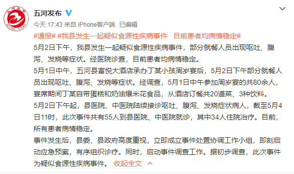 5月4日,安徽省五河县县委对外宣传办公室官微“五河发布”通报,5月2日,该县发生一起疑似食源性疾病事件,部分就餐人员出现呕吐、腹泻、发烧等症状。截至5月4日11时,共有55人到县医院、中医院就诊,其中34人住院治疗。目前,所有患者病情稳定。