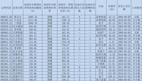 报告期内,新五丰(3892.79%)、大北农(3171.66%)、三利谱(2860.28%)3家公司成长预期凸显,净利润有望实现同比增长28倍以上,包括嘉麟杰、达安基因、亚玛顿、天保基建、九安医疗、海得控制、大立科技、威创股份、天赐材料、海欣食品、宁波联合、金洲管道、沃华医药、北新建材、普利特、亚太实业等在内的39家公司净利润有望实现同比翻番。