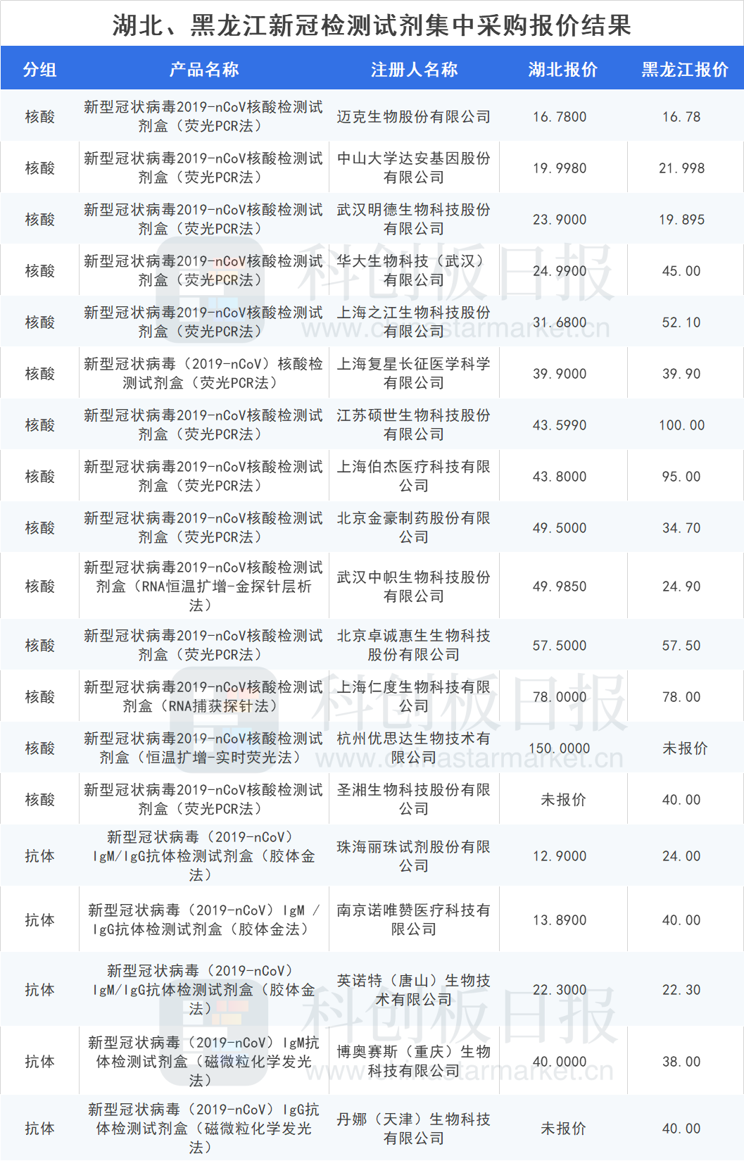 以下是湖北、黑龙江、福建三省新冠检测试剂集中采购结果,其中湖北是最早完成的省份,黑龙江次之,福建则还未官方发布相关结果。