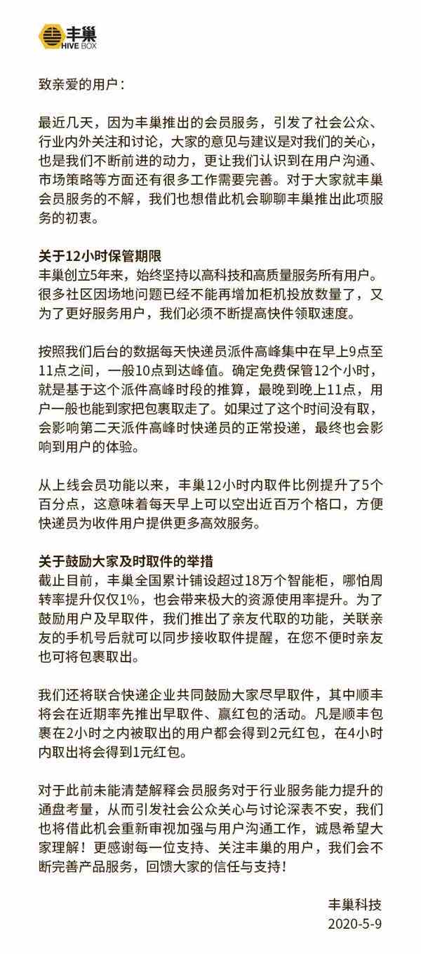 5月9日,丰巢在《致亲爱的用户一封信》中提到,为更好服务用户,必须不断提高快件领取速度。“截至目前,丰巢全国累计铺设超过18万个智能柜,哪怕周转率提升仅仅1%,也会带来资源使用率的提升。”