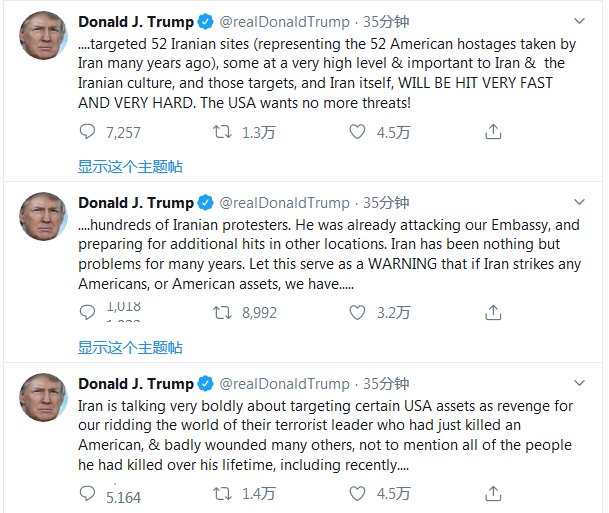 在推特中,他表示:如果伊朗人敢袭击美国人或美国资产,伊朗52处目标将遭受又快又狠的打击!
