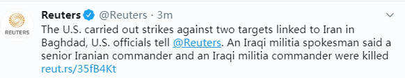 路透社、CNN、RT等多家外媒援引伊拉克什叶派民兵武装“人民动员组织”发言人的话称,当地时间周五凌晨,该组织指挥官阿布·马赫迪·穆罕迪斯和伊朗伊斯兰革命卫队特种部队"圣城旅”高级军官卡西姆·索莱马尼少将乘坐的车辆遭遇3枚火箭弹袭击,这两位重要指挥官丧生,“死敌美国和以色列需要为他们的死负责”。法新社此前报道称,至少8人在袭击中死亡,而美国国防部匿名官员向路透社证实,美国当日对巴格达两处与伊朗有关的目标实施了打击。