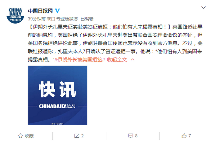 英国路透社早前的消息称,美国拒绝了伊朗外长扎里夫赴美出席联合国安理会会议的签证,但美国务院拒绝评论此事,伊朗驻联合国使团也表示没有收到官方消息。不过,美联社报道称,扎里夫本人7日确认了签证遭拒一事。他说:“他们怕有人到美国来揭露真相。”