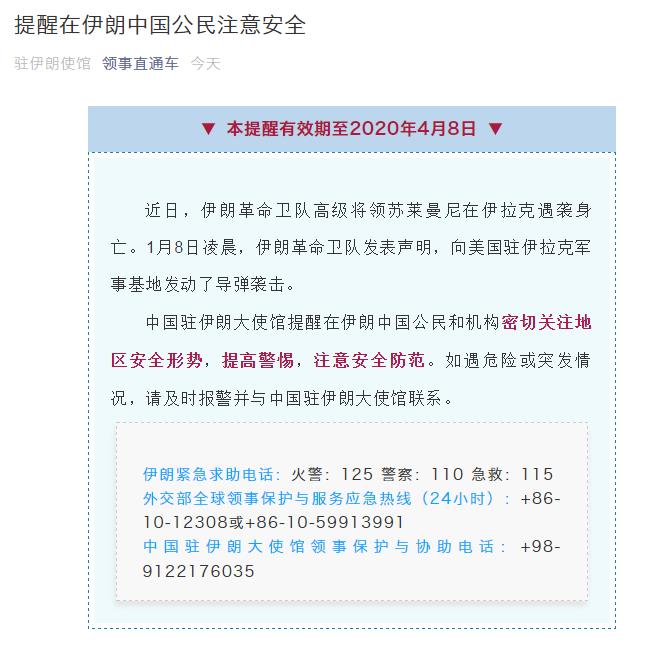 中国驻伊朗大使馆提醒在伊朗中国公民和机构密切关注地区安全形势,提高警惕,注意安全防范。如遇危险或突发情况,请及时报警并与中国驻伊朗大使馆联系。
