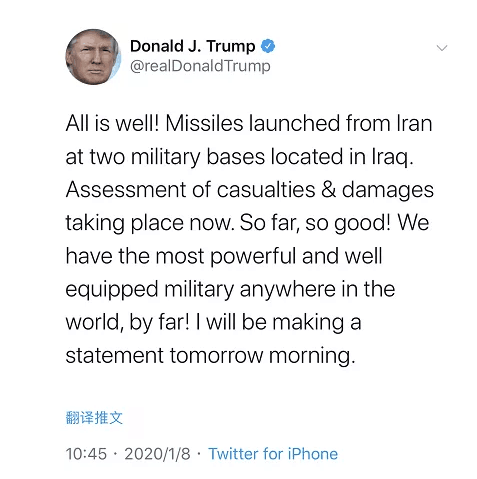 美军驻伊拉克基地受袭后,特朗普更新了一条推特:“都挺好!伊朗向我们在伊拉克的基地发射了数枚导弹,目前伤亡和损失评估正在进行中。到目前为止,还好!不论在世界任何地方,我们都有战力最强、装备最先进的军队!明早,我将发表一份声明!”