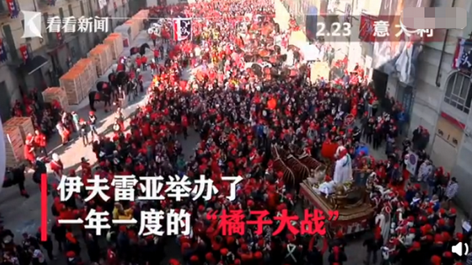 尽管意大利已经成了亚洲以外新冠肺炎疫情最严重的国家,意大利北部11个市镇封城隔离。但在2月23日,伊夫雷亚一年一度的“橘子大战”依旧照常举行。受到疫情影响,大街上仍是聚集了约15000人。活动预计将持续3天。截至当地时间2月23日下午,意大利新冠肺炎感染人数累计达152例,其中含3例死亡病例。