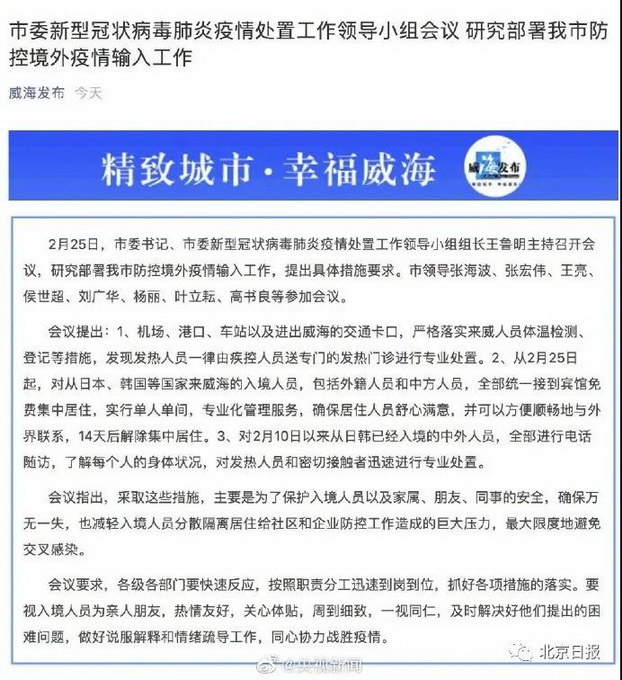 山东省威海市研究部署威海防控境外疫情输入工作,要求从2月25日起,对从日本、韩国等国家来威海的入境人员,包括外籍人员和中方人员,全部统一接到宾馆免费集中居住,14天后解除集中居住。