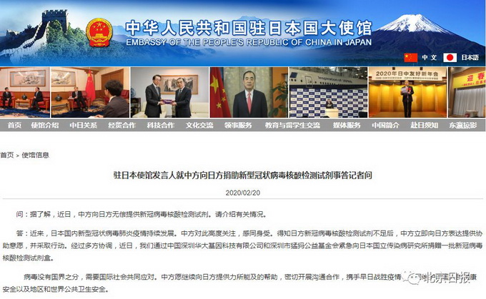 中国驻日本使馆2月20日发布消息称,日本国内新型冠状病毒肺炎疫情持续发展,得知日方新冠病毒核酸检测试剂不足后,中方通过中国深圳华大基因科技有限公司和深圳市猛犸公益基金会紧急向日本国立传染病研究所捐赠一批新冠病毒核酸检测试剂盒。
