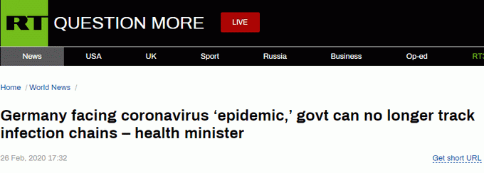 RT介绍称,跟踪“感染链”——记录感染者此前的旅行和社交接触,对于了解疾病的传播至关重要。到目前为止,有关部门发现,德国的大多数患者近期有意大利和中国旅行史,或者与其他旅行者有过接触。然而,施潘25日曾表示,德国正面临新的问题:感染链不完全可追踪。据“今日俄罗斯”(RT)报道,当地时间周三(26日),德国卫生部长延斯·施潘在柏林告诉记者,德国正处于新冠肺炎疫情“大流行”的开始阶段。自从在意大利北部暴发以来,新冠肺炎疫情已经蔓延至十几个欧洲国家。