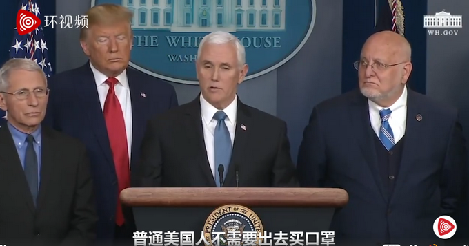 2月29日,美国副总统彭斯在白宫举行的有关冠状病毒制剂的新闻发布会上表示,普通美国人不需要出去买口罩,政府储备了4000万个外科口罩。