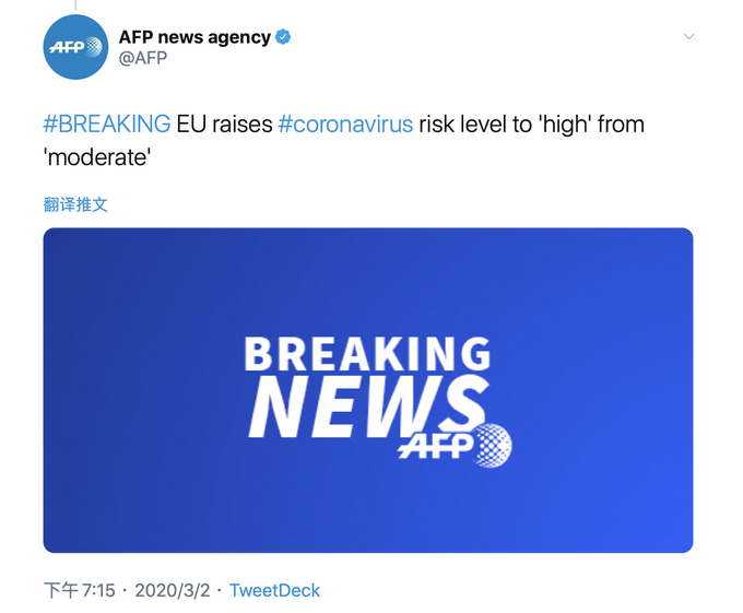 据法新社刚刚消息,欧盟将新型冠状病毒风险级别由“中等”提升至“高(级别)”。