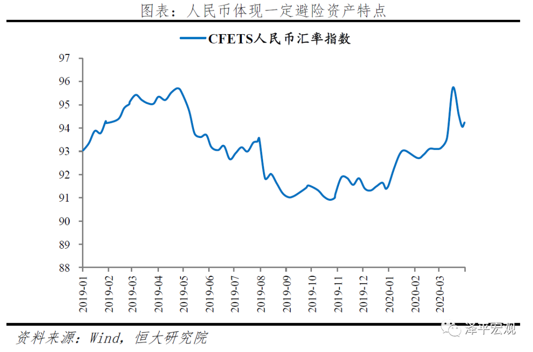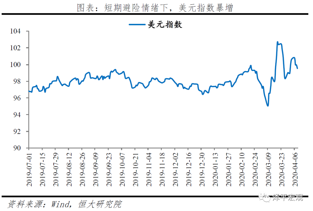 短期避险情绪下,持有美元需求增强,美元指数持续上涨。3月,外汇市场一度呈现“美元荒”,流动性危机发生时所有风险资产同步下跌,资金需求快速上升,3月9日-3月19日美元指数飙升,相对其他发达国家货币平均升值幅度达8%。与我国而言,进出口主要受贸易和外需影响,汇率传导作用不明显。由于我国率先控制住疫情,在此次流动性危机爆发时体现出一定避险资产的特点,2020年以来的宽货币未导致明显贬值。进出口的主要受贸易和外需影响,疫情冲击海外经济增长和消费意愿,导致外需收缩,负面冲击我国出口企业,此外,海外产业链断供或减产也对进口的中下游企业不利。