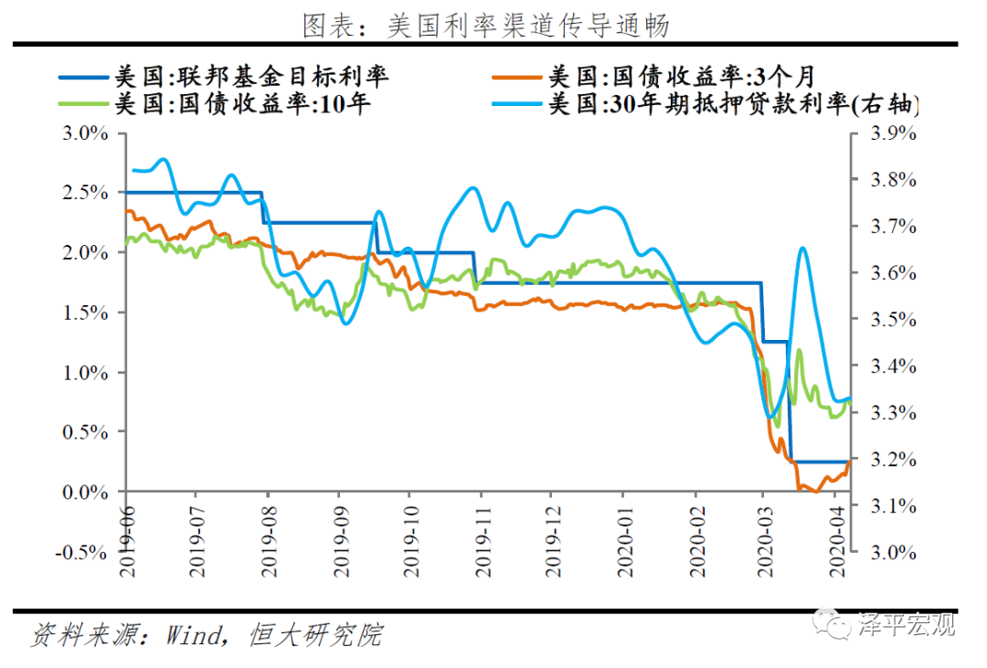 美国利率传导渠道通畅。美联储3月紧急两次降息迅速传导至3个月国债收益率,收益率从1.5%降至0.0%。政策利率一是带动债券收益率从恐慌高点快速下行,二是引起贷款利率趋势下行。由于美国直接融资占比达70%以上,上市企业众多,低利率能够迅速传导至实体企业融资成本,降低企业负担。