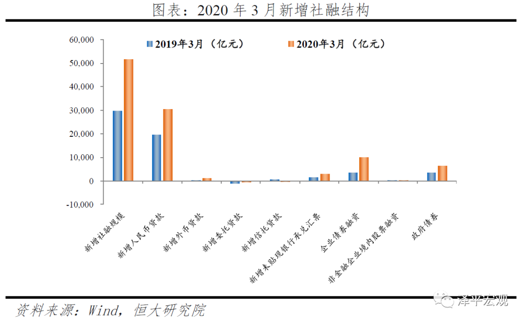 从结构来看,3月信贷加速投放、企业债放量发行、政府债同比多增,构成主要支撑。表内融资方面,信贷同比大幅多增。3月新增人民币贷款3万亿元,同比多增1万亿元。政策发力支撑信贷,但内外需冲击下企业中长期投资需求下滑,短期融资占比仍处高位。表外融资方面,未贴现票据带动表外同比多增。3月表外融资新增2208亿元,同比多增1385亿元。其中,未贴现承兑汇票同比多增1453亿元,是表外融资的主要支撑。3月表内外票据均有增长,主要受票据利率快速下行、企业短期融资需求上升、银行风险偏好低影响。信托贷款同比多减550亿元,主要受到期量增加拖累。直接融资方面,企业债券融资大幅增长,股票融资有所上行。3月新增股票融资197亿元,同比微增75亿元;新增企业债券融资9953亿元,同比大幅多增6407亿元,达到历史高点,注册制实施、信用债发行门槛降低,叠加利率下行,带动企业债券融资大幅多增。3月31日国常会提出引导公司信用类债券净融资比上年多增1万亿元,预计未来企业债仍将对社融构成支撑。其他融资方面,政府债券同比多增。3月新增政府债券6363亿元,同比多增2951亿元。3月27日政治局会议提出适当提高赤字率、发行特别国债、增加地方政府专项债规模,政府债券后续将继续支撑社融增长。