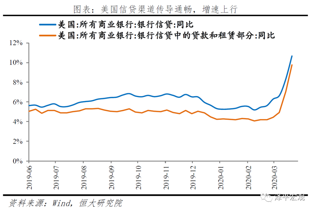 美国信贷渠道暂时未明显受损。美联储为防止流动性危机触发金融危机,引起金融机构资产负债表衰退,进而缩表引起实体企业资产负债表衰退,超前力度向市场注入流动性,短期稳定了金融机构资产负债表,从商业银行信贷同比增速来看,信贷投放暂时并未受到疫情严重影响。然而随着疫情影响持续,企业债务违约风险暴露,金融机构损失加剧,未来信贷渠道传导仍面临较大不确定风险。