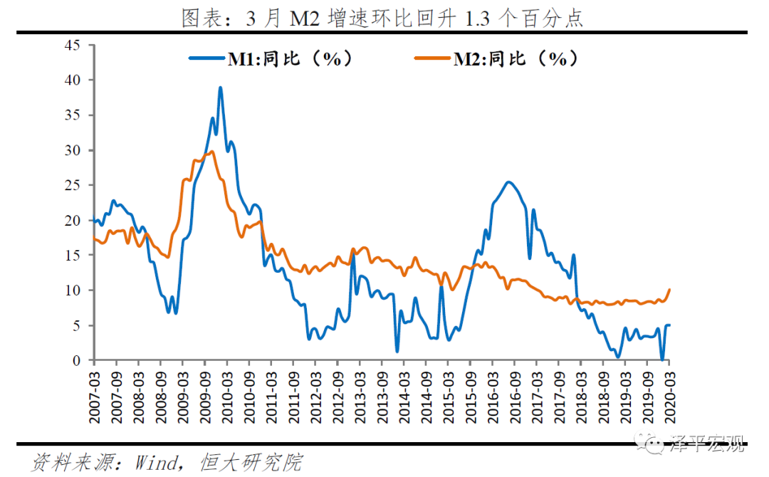 3月M2同比增速10.1%,环比大幅增长1.3个百分点。3月央行定向降准释放长期资金,银行加大信贷投放及债券购买力度,财政加大对实体支持,共同带动M2增速回升。从结构来看,3月企业存款增加3.2万亿元,同比多增1.3万亿元,主要因企业贷款多增派生存款。居民存款增加2.4万亿元,同比多增1.5亿元,线下消费、购房活动尚未完全恢复,同时3月股市下跌、分流效应减弱。财政存款减少7353亿元,环比多减7561亿元,推升M2增速回升。非银金融机构存款减少1.4万亿元,同比多减2989亿元。M1同比增速5%,环比回升0.2个百分点,实体交易性需求逐步恢复。