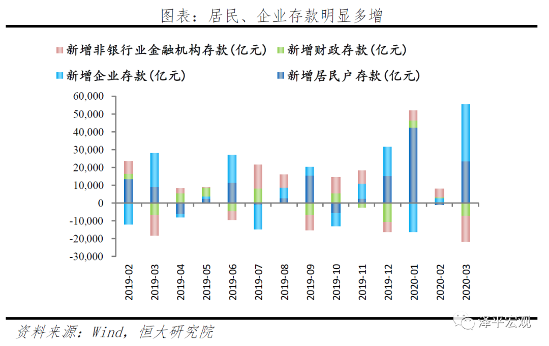 从结构来看,企业信贷仍是主要支撑,但内外需冲击下企业中长期投融资意愿不强,短期融资占比仍处高位。3月新增企业贷款2.05万亿元,同比多增9841亿元。短期贷款、中长期贷款、票据融资分别多增5651亿元、3070亿元、1097亿元。政策面持续发力支撑信贷总量,但内外需冲击下,企业短期流动性需求上升、中长期投资需求下降。短贷及票据融资占比由2月的29.6%上升至56%、企业中长期贷款占比由2月的45.9%下降至33.8%,考虑到专项债发行对基建配套贷款的带动作用,实体中长期投融资需求或依然不强。融资环境改善无法在短时间内快速提高企业的投资意愿,疫情得到有效管控+流动性需求缓解+财政政策发力对冲内外需下行仍是实体预期改善的关键。3月新增居民贷款9892亿元,同比多增984亿元。其中,短期贷款新增5144亿元,同比多增850亿元,3月疫情冲击缓和,商场逐步开业,居民线下消费部分修复。中长期贷款增加4738亿元,同比多增133亿元,3月商品房销售环比改善明显,且部分1、2月按揭贷款延迟至3月发放,带动中长期贷款增长。