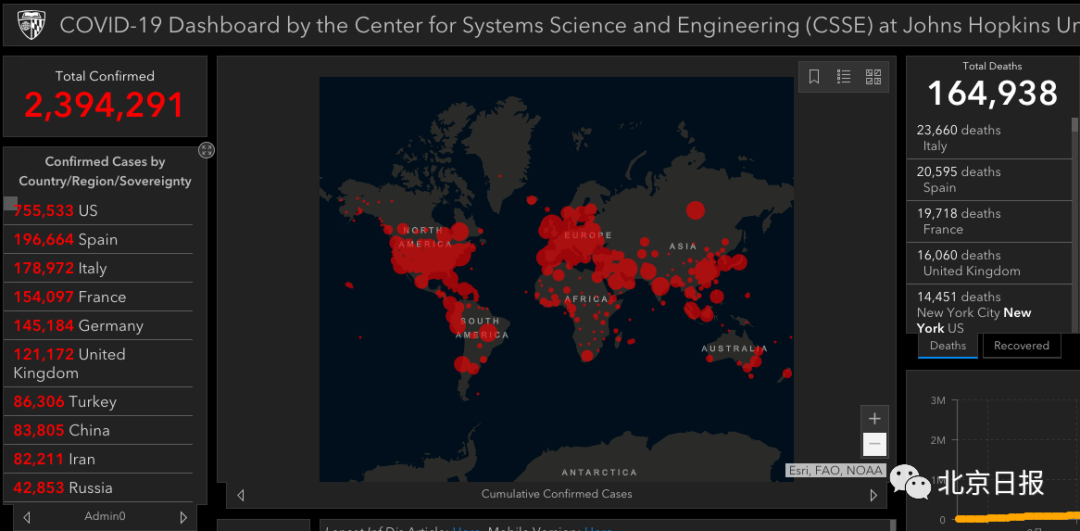 据美国约翰逊·霍普金斯大学统计,截至北京时间4月20日7时,全球累计确诊数据逼近240万例,达2394291,死亡病例破16万例,为164938。其中,美国死亡病例突破了4万例,约占全球四分之一,累计确诊病例突破75万,达755533。