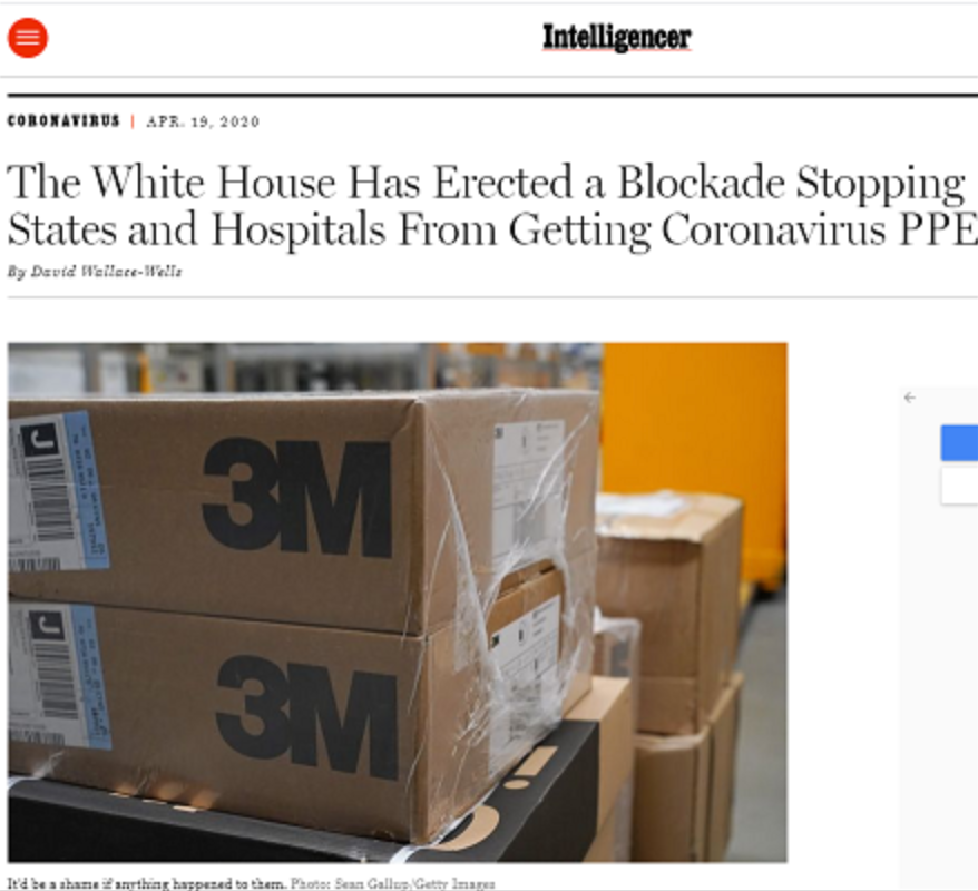 美国媒体《情报员》发文批评白宫设立屏障,阻挠各州与医院获取个人防护物资。