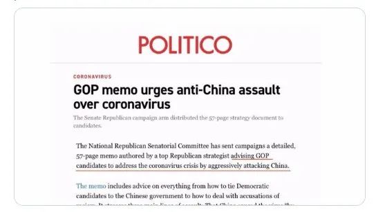 更为荒诞的是,为了捞取选票,美共和党参议院全国委员会近日向竞选机构发送了一份长达57页的备忘录,建议共和党候选人通过积极攻击中国来应对新冠疫情危机,并提供了三种主要攻击中国的套路:一是污蔑“中国掩盖真相导致病毒蔓延”,二是指责民主党人“对中国态度软弱”,三是强调共和党人将“因中国导致了此次疫情的传播而推动对中国的制裁”。