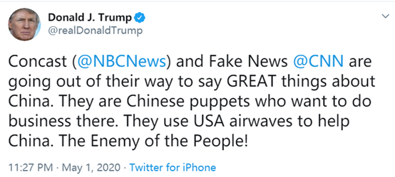 5月1日,美国总统特朗普突然发布一则言辞激烈的推文,指责美国全国广播电视台(NBC)和美国有线电视新闻网(CNN)是“中国傀儡”、“人民公敌” 。