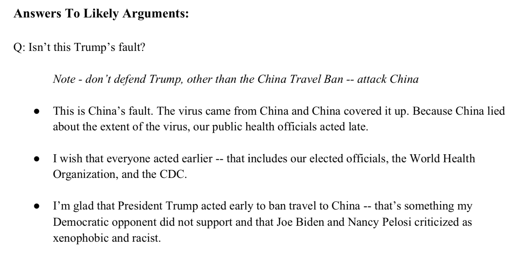 例如,当被问及特朗普是否应为美国疫情应对不力承担责任,备忘录建议:“不要为特朗普辩解——攻击中国就行。”备忘录还宣称:“疫情蔓延就是中国的错,病毒来自中国,中国还隐瞒了疫情。”