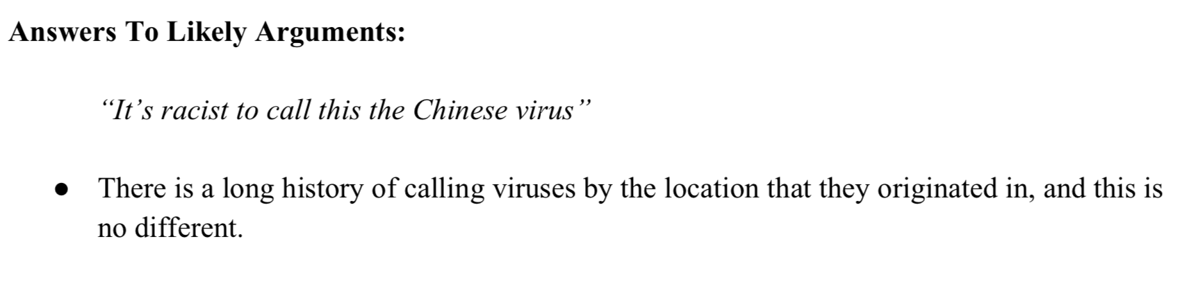 若面对种族主义的指控,该备忘录称:“很长一段时间里,人们都是根据病毒的起源地来称呼它们的,这次也不例外。”