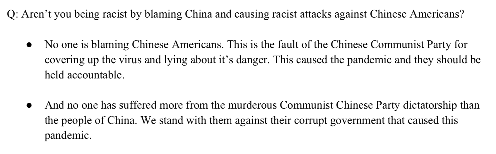 在被问及“甩锅”中国涉嫌煽动种族主义时,候选人被要求这样回答:“没有人指责华裔美国人。这是中方的错,是他们‘掩盖’病毒,‘谎报’其危险性,这才导致了大流行,他们应该对此负责。”