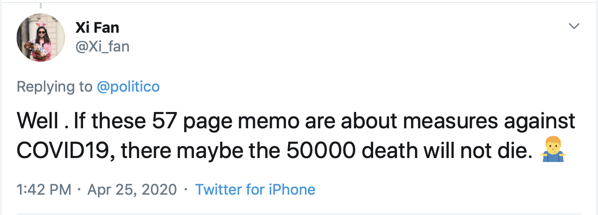 网民:“如果这份57页的备忘录是关于应对疫情的,或许那5万多因疫情死亡的美国人就不会死了。”↓↓↓