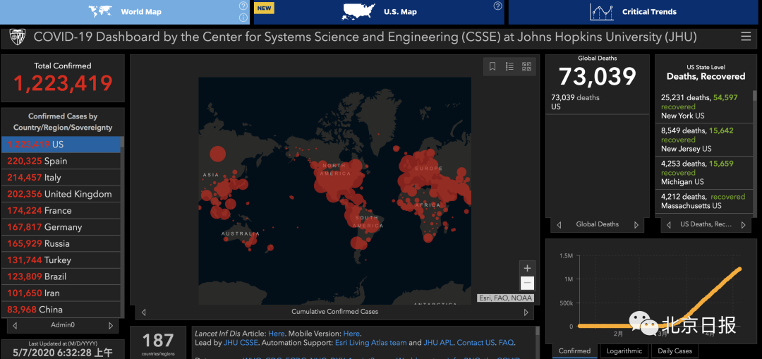 约翰斯·霍普金斯大学数据实时数据显示,截至北京时间5月7日6时30分左右,美国累计确诊超122万例,达1223419例,死亡73039例。