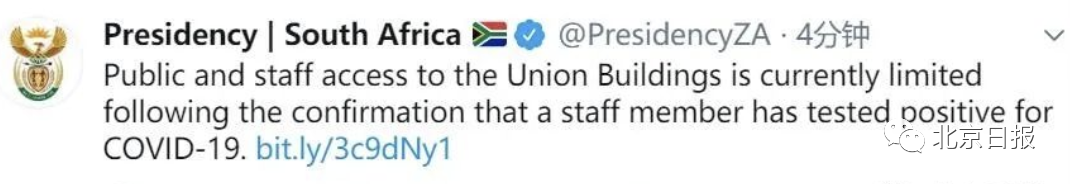 据报道,在确认一名工作人员新冠病毒检测呈阳性后,南非公众和工作人员进入大楼的通道已经受到限制。