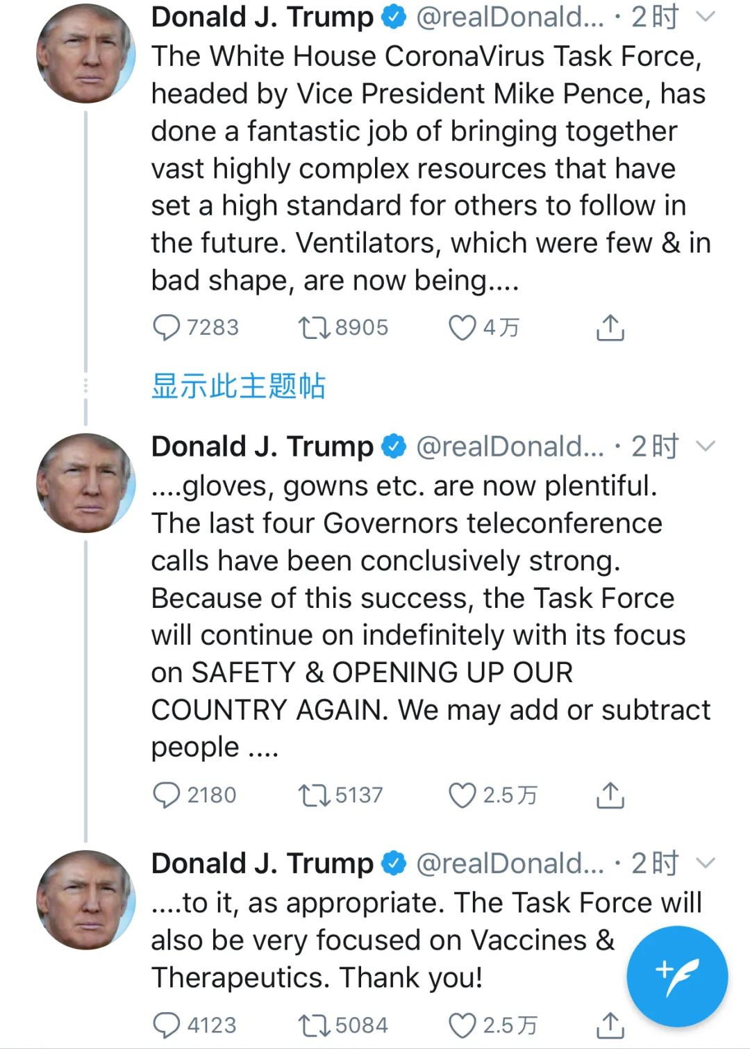这才过了1天,特朗普就变卦了。《华尔街日报》报道,6日,特朗普发推特称,白宫新冠疫情应对工作组会无限期工作,但是新重心会放在安全和重启经济上。