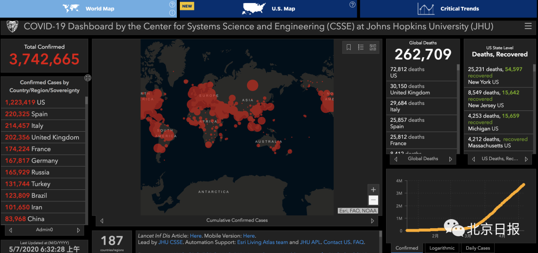 据美国约翰斯·霍普金斯大学数据实时数据,截至北京时间5月7日6时32分左右,全球累计确诊超374万例,为3742665例,累计死亡超26万例。已有40个国家确诊人数超过1万例。