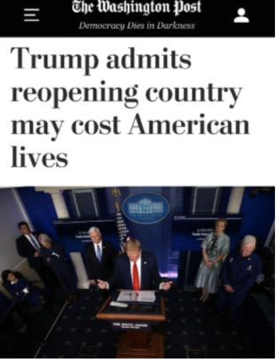 特朗普认为,社交疏远措施已导致人们过量吸毒和自杀。“看看发生了什么。人们正在失去工作。我们必须把它找回来,这就是我们正在做的。”他鼓励美国人将自己视为“勇士”,敦促国家朝着重启经济的方向迈进,坚称长期坚持严格的社交疏离规定是不现实的。