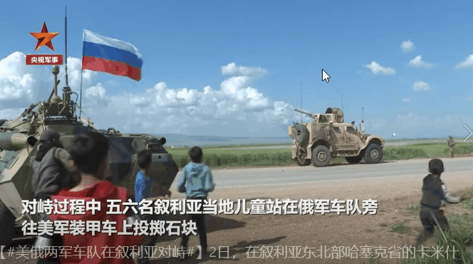 5月2日,由10辆装甲车组成的美军车队在穿越叙利亚卡米什利地区中心地带时,遭遇俄军车队拦截。现场画面显示,两军相距不到50米,对峙过程中,五六名叙利亚儿童朝美军装甲车投掷石块。最终,俄军车队在美军注视下,率先通过公路。