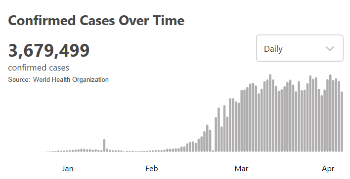 根据世卫组织最新实时统计数据,全球确诊新冠肺炎3679499例,累计死亡254199例。