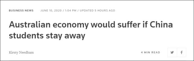 据路透社6月10日报道,澳大利亚贸易部长当天承认,如果中国留学生听取建议选择远离澳大利亚,那么该国经济将受到打击。目前,澳大利亚正面临新冠疫情引发的30年来首次经济衰退。中国是澳大利亚最重要的贸易伙伴,也是赴澳留学生最多的国家:据澳大利亚教育部数据,2019年中国内地在澳留学人数达占比27.3%,贡献了该国国际教育总收入(约合1847亿元人民币)的约三分之一。