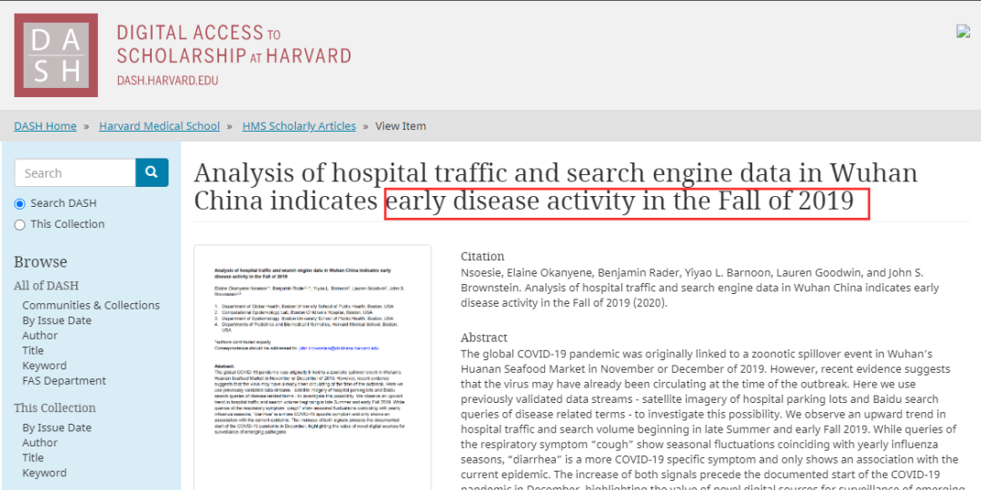 就在这时,一篇耸人听闻的文章冒了出来,称“武汉在2019年秋天就可能有(新冠)病毒迹象”。而其创作团队来自全球顶尖学府哈佛大学医学院,研究方法竟然是分析武汉医院附近交通流量和相关百度搜索。