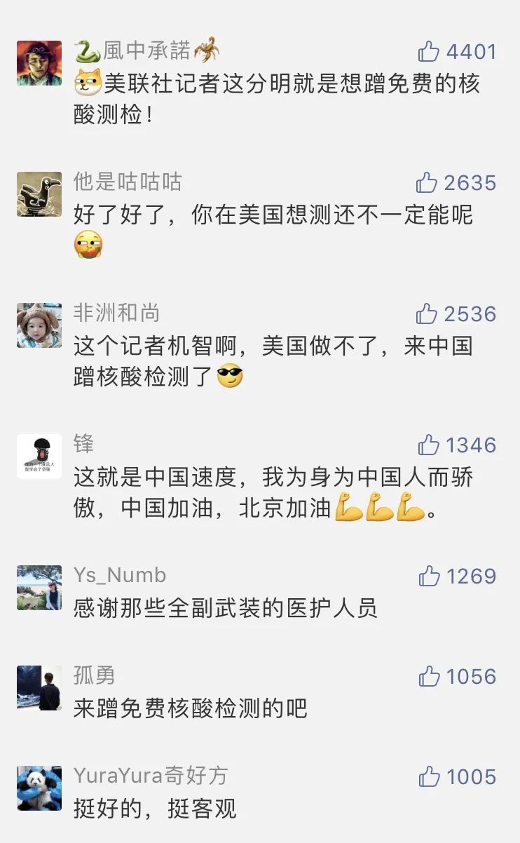 话虽调侃,理却没错。同样面对疫情,相较于美国民众被迫接受总统所谓的“这就是人生”,中国民众一直处于高效有力的保护中,“应检尽检”,连美国记者也跟着沾了光。