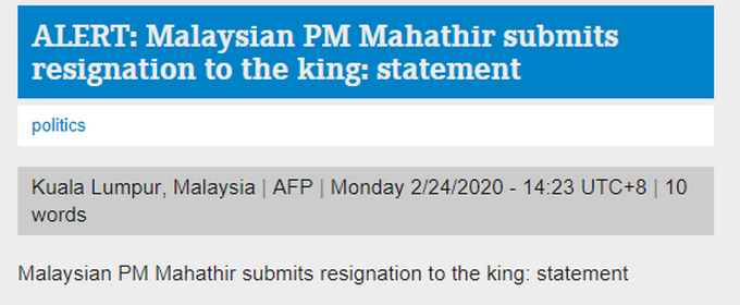 马哈蒂尔曾于1981年至2003年担任总理22年,是马来西亚任职时间最长的总理。2018年5月,马哈蒂尔再次赢得大选宣誓就职总理。马来西亚总理马哈蒂尔将在今天向国家元首递交辞呈。马来西亚总理秘书24日在接受马来西亚媒体《星洲日报》采访时说,总理署稍后会发布公告交待该事件。