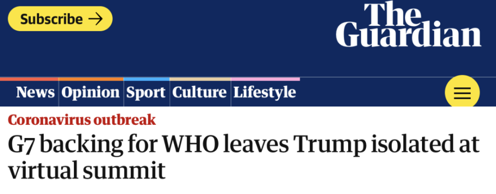 英国《卫报》刊登了题为《七国集团(G7)对世卫组织的支持使特朗普在线上峰会中被孤立》的文章,文章指出德国总理默克尔、加拿大总理特鲁多对于WHO事件的态度与白宫声明中有所出入。