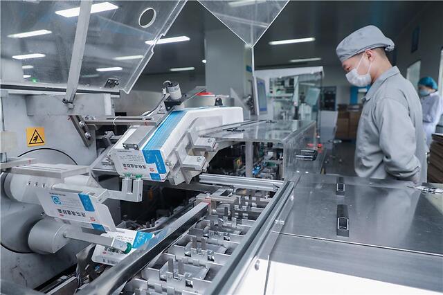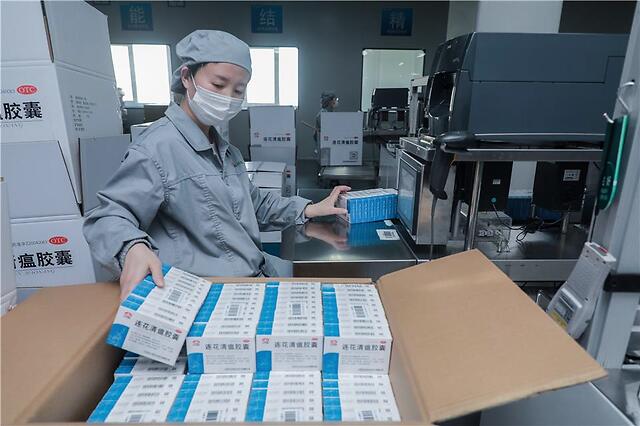 近日,在河北省石家庄市以岭药业制剂车间内,工人正在打包连花清瘟胶囊。