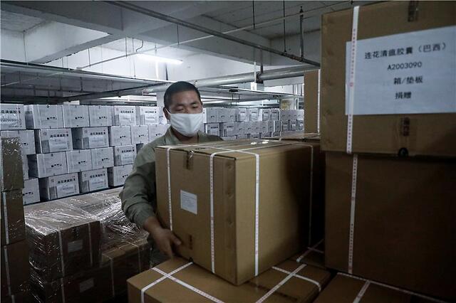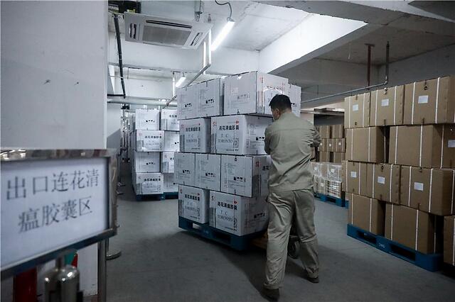 在河北省石家庄市以岭药业仓库出口区,工人正在搬运即将发送到国外的连花清瘟胶囊。