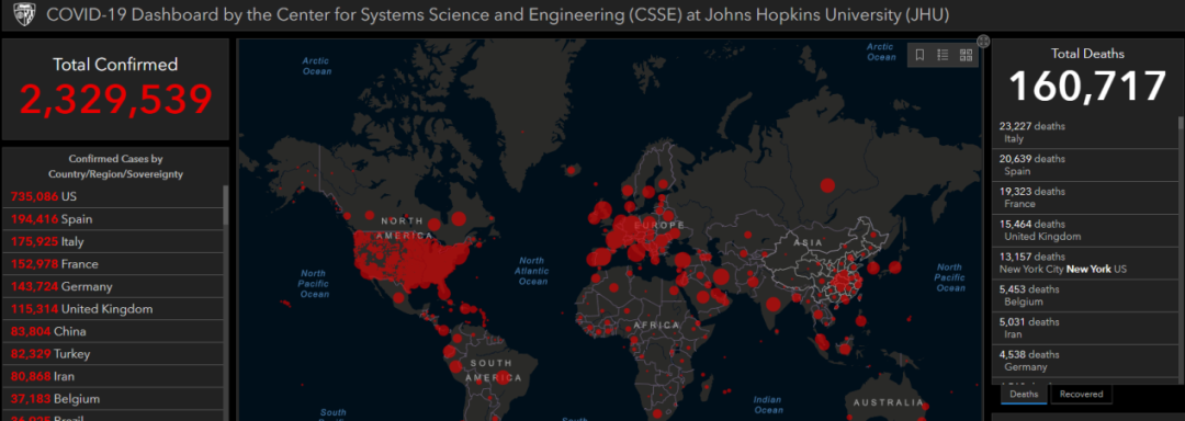 据美国约翰斯霍普金斯大学实时疫情数据显示,截至北京时间4月19日12时20分,全球新冠肺炎累计确诊病例达2329539例;累计死亡160717例。
