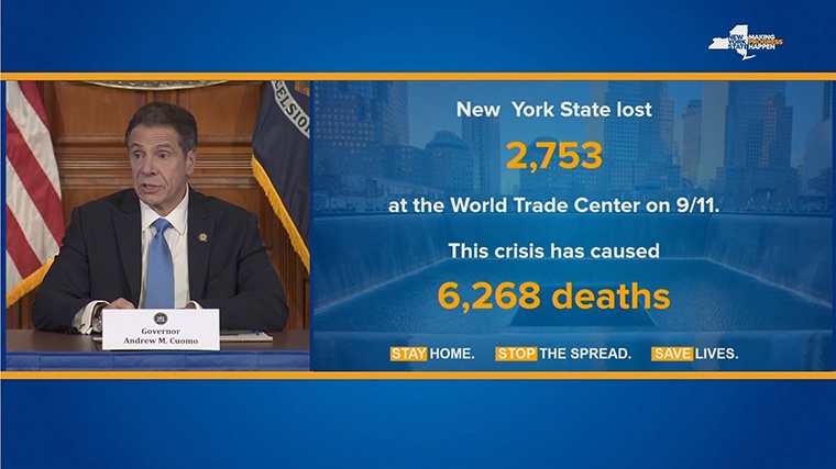 <海外网4月9日|战疫全时区>据彭博社报道,当地时间8日,美国纽约州州长科莫说,过去24小时,纽约州新增死亡病例779例,为有疫情以来增幅最大,累计死亡6268例。科莫表示,纽约州因新冠肺炎死亡人数已经远远超过“9·11”事件,将会下半旗以示哀悼。据了解,2001年在“9·11”恐袭中,共有2753名纽约人丧生。