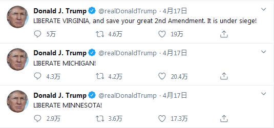 近日,包括密歇根州、明尼苏达州等美国多地都出现了反对当地政府实施“居家令”的抗议活动,而特朗普则17日连发三条推特以示支持。他分别写道“解放密歇根州”、“解放明尼苏达州”、“解放弗吉尼亚州,拯救你们伟大的宪法第二修正案(即公民有持枪权)。它正在受到封锁。”