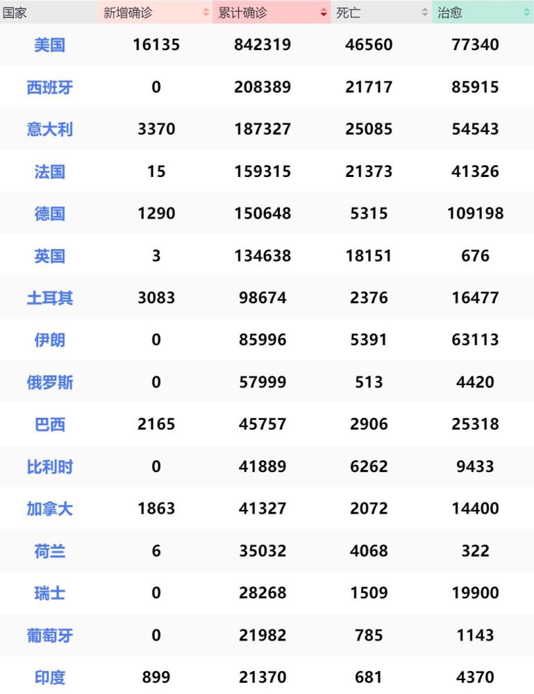 美国约翰斯・霍普金斯大学统计数据显示,全球累计确诊超1万例的有30个国家,其中美国、西班牙、意大利、法国、德国和英国6个国家的累计确诊病例超10万例。
